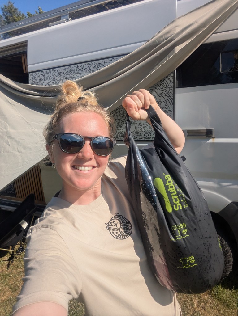 We have 66 liters in our water tank meaning we naturally have to be very conservative with water usage. The average person in the UK uses about 142 liters of water per day… so it is safe to say we are forced to be sustainable with water usage as 66 liters (for two of us) usually lasts us between 3-4 days. We manage this with super short showers, only filling the sink with a little bit of water to wash our dishes, and not having a flushing toilet helps.